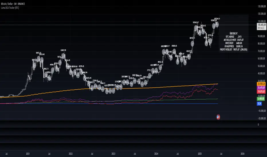 This indicator simulates a regular Bitcoin investment strategy (Dollar Cost Averaging). It calculates and visualizes: