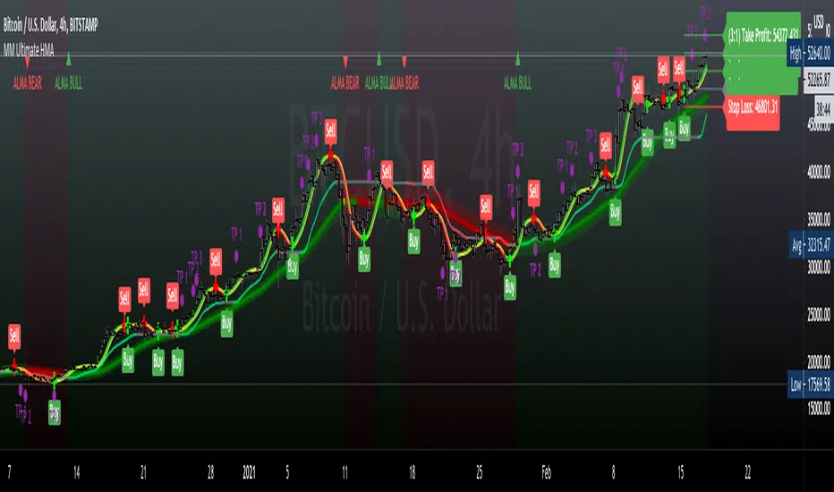 has built in generated signals with entry, Atr calculated stop loss, and 3tp levels that can be turned off in the settings. every time a signal is generated.