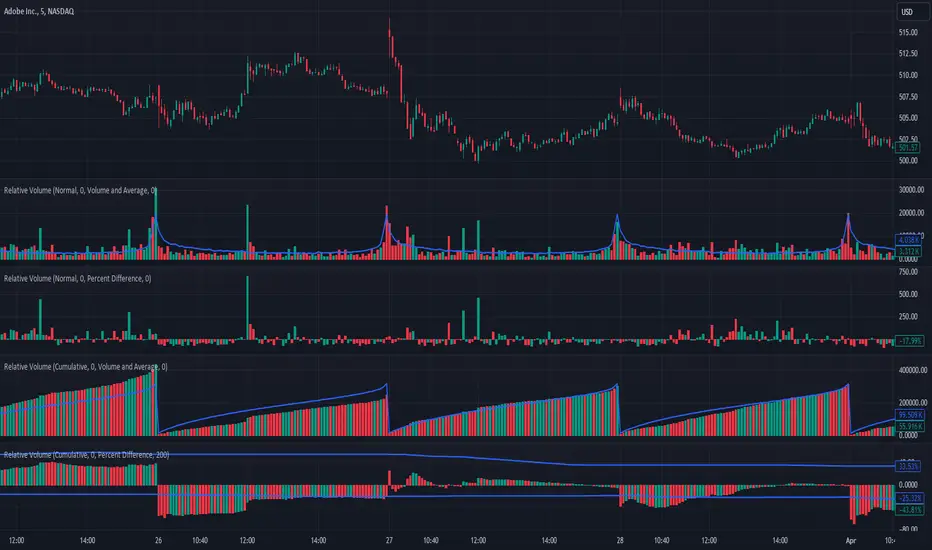 Relative Volume take the volume at a given time of day and compares it to the average volume at that time of day. You can either use the current volume or the cumulative volume in this analysis. You have the option to either see the average and the current volume or a comparative view where you see the percent difference between now and the average.