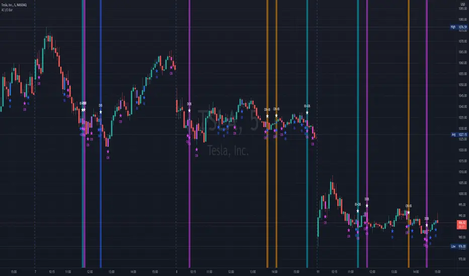 This indicator colors the candle body based on whether it closed as an Inside Bar (IB) or an Outside Bar (OB).
