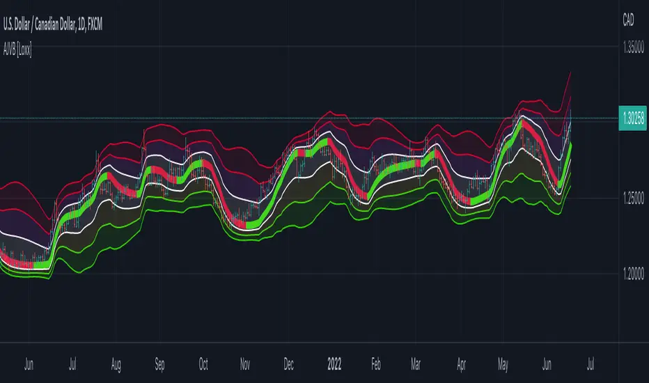 Adaptive Jurik Filter Volatility Bands [Loxx] uses Jurik Volty [Loxx] and Adaptive, Double Jurik Filter Moving Average (AJFMA) [Loxx] to derive Jurik Filter smoothed volatility channels around an Adaptive Jurik Filter Moving Average. Bands are placed at 1, 2, and 3 deviations from the core basline.