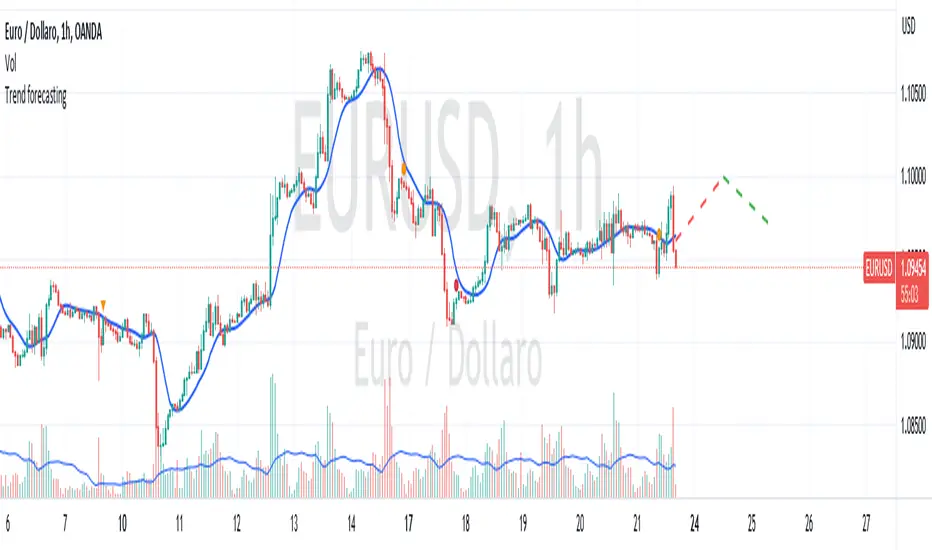 Questo codice è uno script di previsione del trend creato solo a scopo didattico. Utilizza una media mobile esponenziale (EMA) e una media mobile di Hull (HMA) per calcolare il trend attuale e prevedere il trend futuro. Il codice utilizza anche una regressione lineare per calcolare il trend attuale e un fattore di smorzamento per regolare l’effetto della regressione lineare sulla previsione del trend. Infine il codice disegna due linee tratteggiate per mostrare la previsione del trend per i periodi futuri specificati dall’utente. Se ti piace l'idea mettimi un boost e lascia un commento!