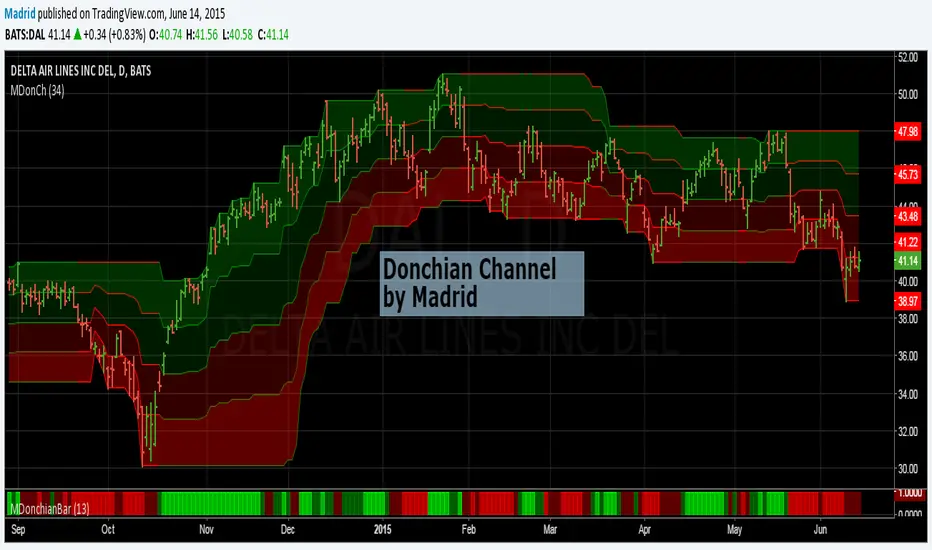 Donchian channel only displays one channel with two bands. This variation displays four bands. When the price is in the uppermost band it is bullish, when the price is in the lowest band it is bearish.