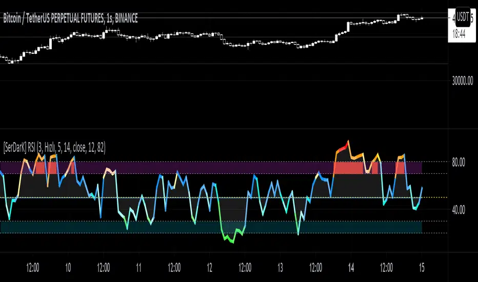 EN: Coloring by levels, overbought, oversold, 50 level and RSS have been added to the classic RSI indicator. Two periods can be selected and almost all of the features can be adjusted from the settings.