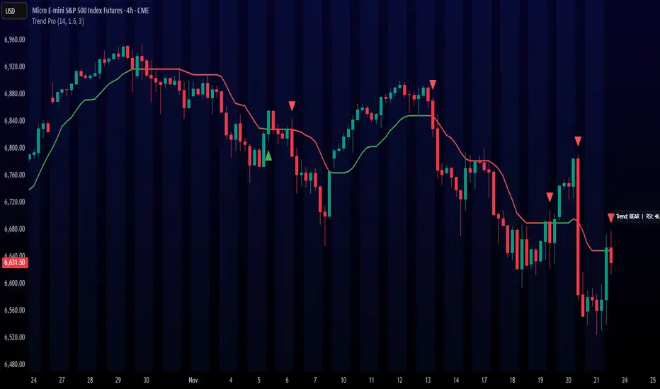 Trend Pro builds a dynamic volatility channel using ATR and tracks whether price stays above or below this adaptive line.