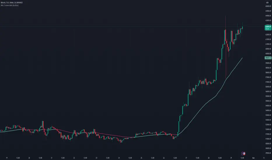 This connectable moving average indicator is part of an indicator system designed to help test, visualize and build strategy configurations without coding. Like all connectable indicators, it interacts through the TradingView input source, which serves as a signal connector to link indicators to each other. All connectable indicators send signal weight to the next node in the system until it reaches either a connectable signal monitor, signal filter and/or strategy.