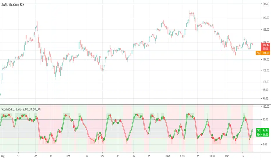 User request. A tuned version of the built-in Stochastic indicator with the following options included: