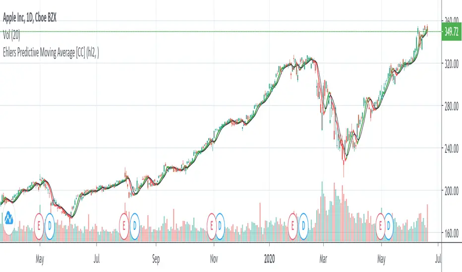 The Predictive Moving Average was created by John Ehlers (Rocket Science For Traders pg 212) and this is one of his first leading indicators. I have been asked by many people for more leading indicators so this one is for you all! Buy when the indicator line is green and sell when it is red.