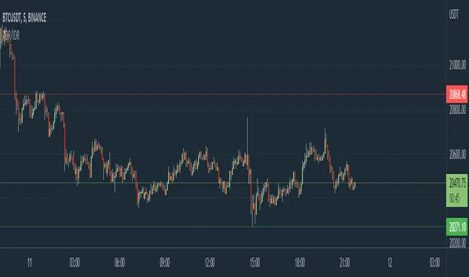 Average Day Range (ADR) is an indicator that calculates the average range of high to low of the candles for a set period of time. This is more useful for intraday trading, where, on an average day, you'd expect price to trade in a range similar to the ADR. This indicator also includes an Intraday Day Range (IDR), which can be used to track progress of the intraday range. By default, IDR is in multiplier form i.e. if it's 2, then the day has traded at a range twice as large as the ADR (you have the option to change IDR to price form if you wish). Therefore, IDR can also be used to measure intraday volatility (as well as taking profit & perhaps fading false breakouts when IDR is at 1x, 1.5x, 2x, etc.) by seeing if today is above/below/at average. This means that this indicator is intended for intraday use, but can be used up to the daily timeframe.