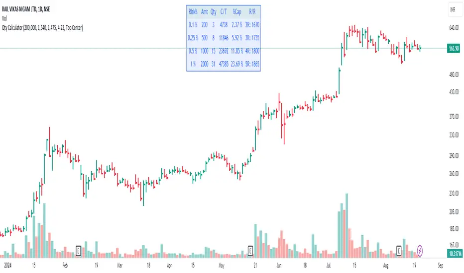 This Pine Script indicator, titled "Qty Calculator," is a customizable tool designed to assist traders in managing their trades by calculating key metrics related to risk management. It takes into account your total capital, entry price, stop-loss level, and desired risk percentage to provide a comprehensive overview of potential trade outcomes.
