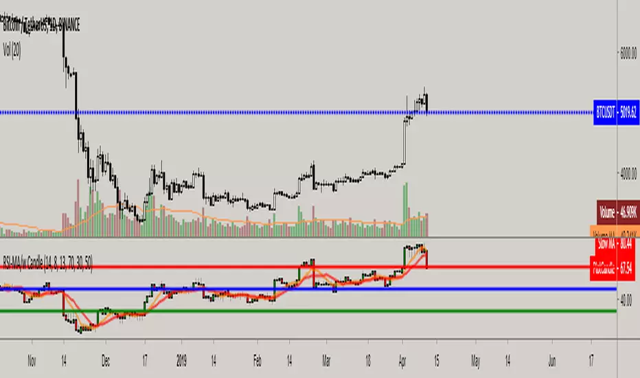 How to use: Similar to candlestick charts, whenever Rsi candle close and stays above moving average(s) it's a buy signal and whenever candle closes below moving average(s), that's a sell signal. Rather than waiting for Rsi to break mid-line(50) to buy and sell, this one offers dynamic and more accurate buy and sell signals. You can also customize top-mid-bottom line values as well to determine overbought and oversold levels.