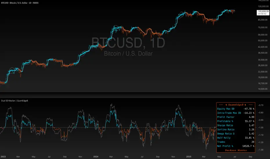 The Dual SD Median calculates a smoothed median price over a defined period, providing a stable central value for trend tracking. It then applies standard deviation bands to dynamically adjust to market conditions.