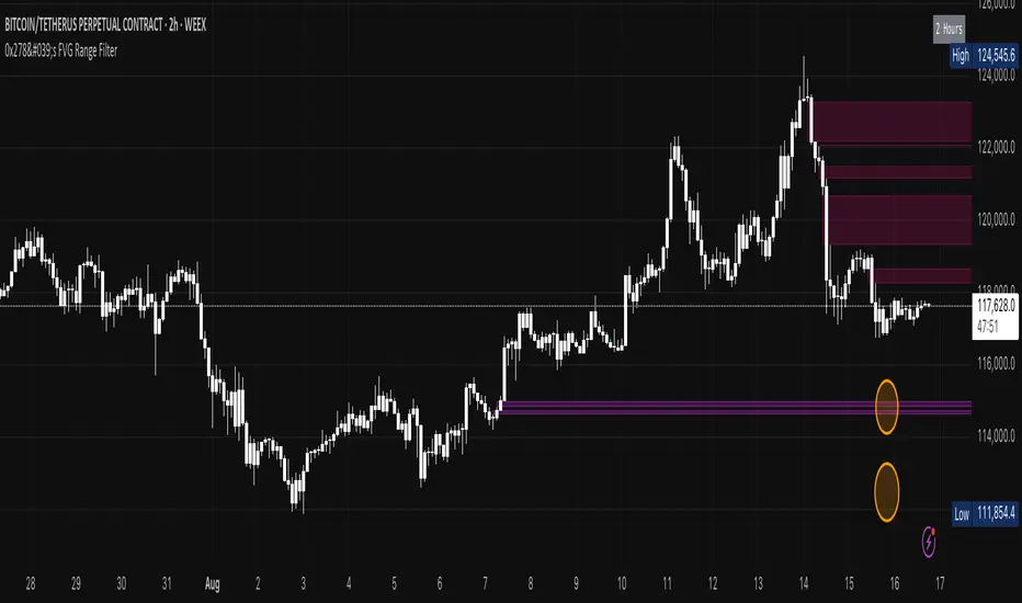 - Range Filter: Only shows FVGs whose midpoint is within a user-defined percentage of the current price. This keeps the focus on gaps that are close enough to be actionable.