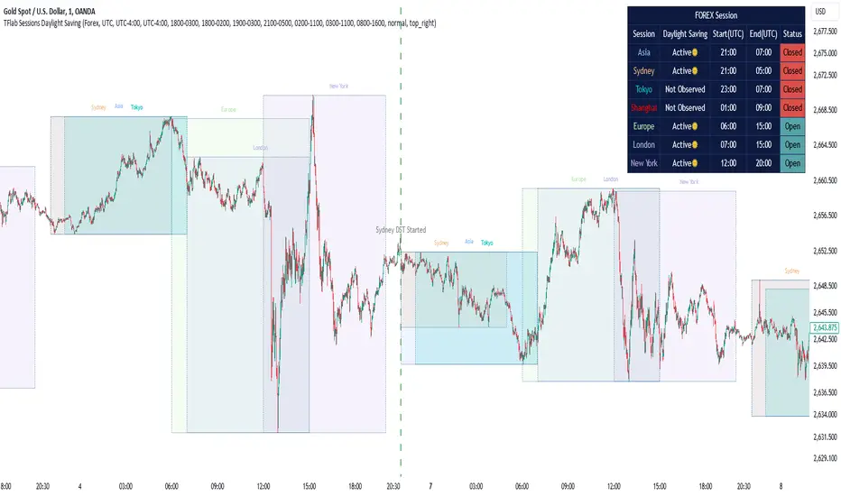 •Automatic Daylight Saving Time (DST) Detection: This indicator dynamically detects Daylight Saving Time (DST) changes for various trading sessions, including New York, London, and Sydney, without requiring manual adjustments. This feature allows traders to manage their trades without worrying about time changes.