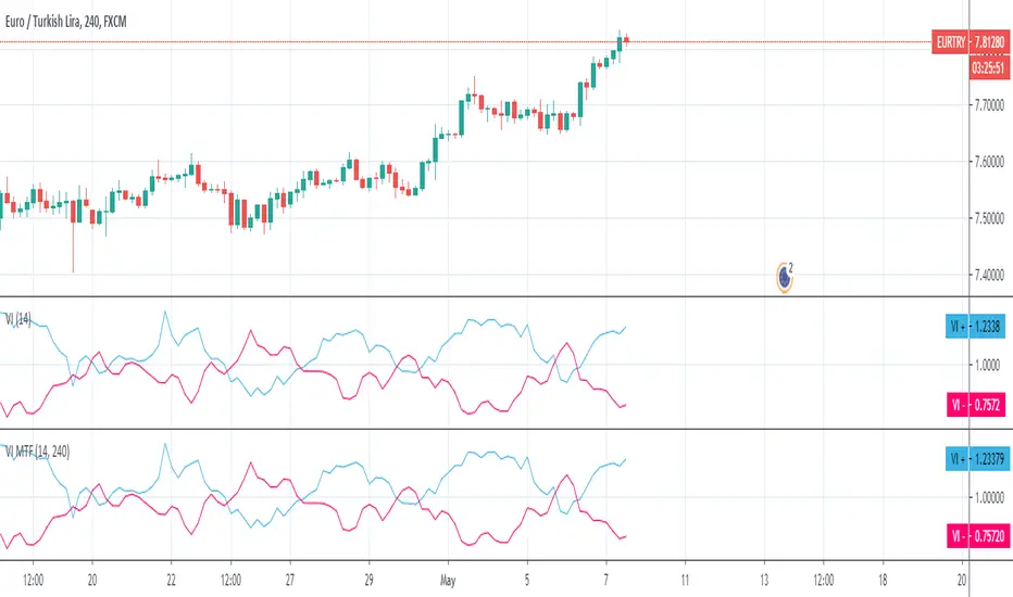 With MTF, you can see the Vortex indicator values for a specific time period without changing the graph time period.