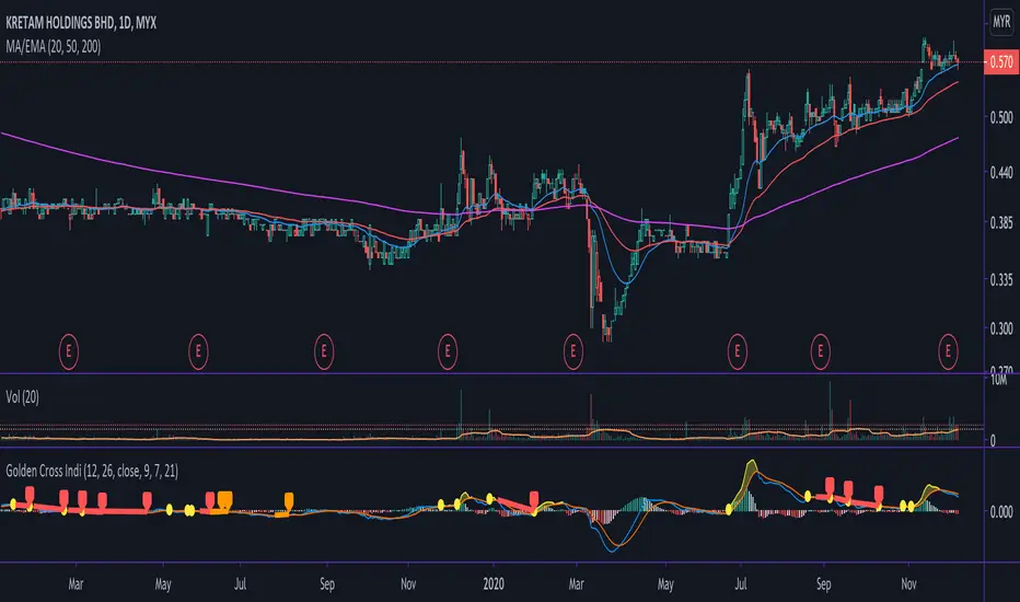 This is a slight modification to the MACD indicator. The golden cross indicator makes use of EMA 7 and EMA 21 as well as MACD together, in which it will turn the MACD line yellow & fill the MACD with a yellow background when MACD is above the signal line and EMA7 is above EMA21. This is best suited for swing trading on a daily timeframe.