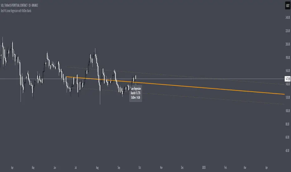 The Best Fit Linear Regression with StdDev Bands is a custom TradingView indicator designed to analyze price trends and volatility over a specified number of bars. It plots a linear regression line representing the best fit for the selected price data, accompanied by optional standard deviation bands to visualize price dispersion.