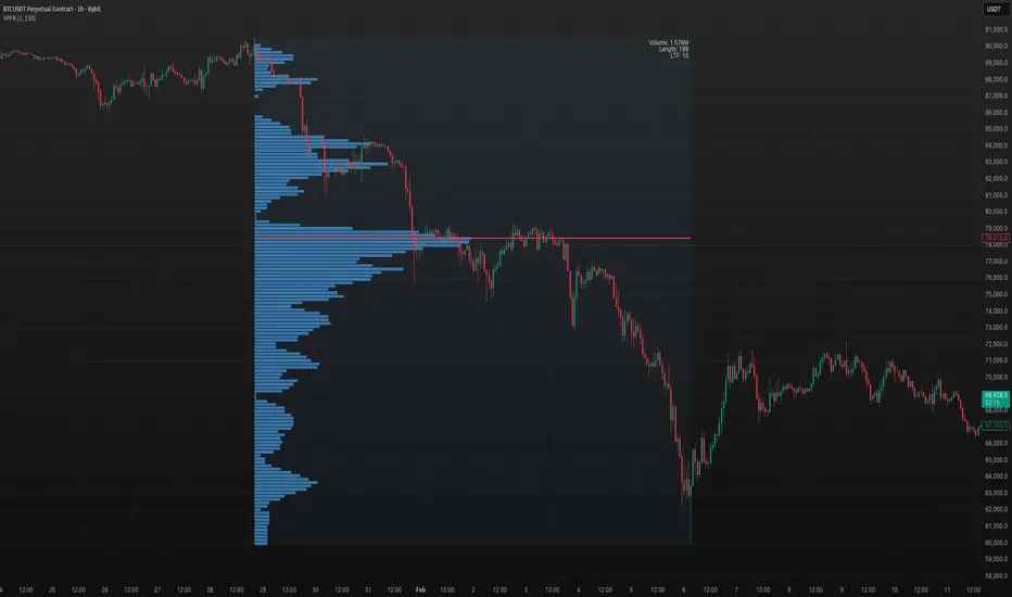 Volume Profile Fixed Range is a technical indicator designed to build a volume profile within a user-defined range. The script distributes volume across price levels using lower timeframe data, allowing traders to identify key liquidity zones and the level with the highest volume concentration (POC).