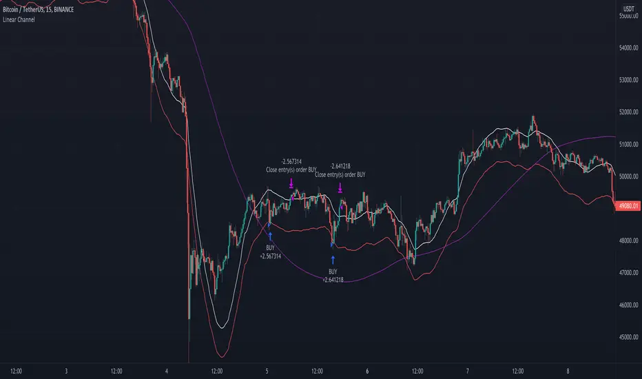 The trade open when price is below band2, but still upper than Hullma. The trade close when price again upper than linreg.