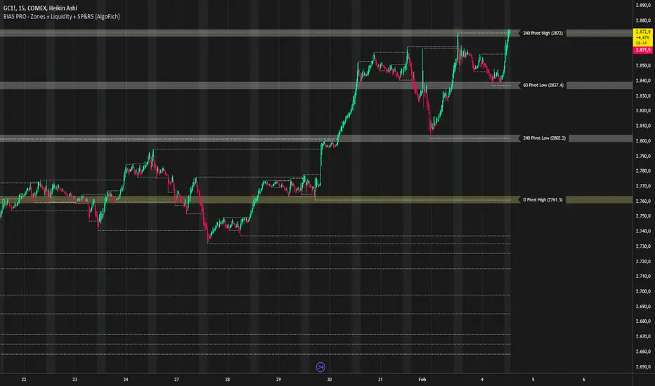 The "BIAS PRO - Zones + Liquidity + SP&RS [AlgoRich]" is an all-in-one indicator that combines the detection of price pivots (swings) with the visual representation of key zones on the chart. With options to customize appearance, manage operational sessions, and group levels across different timeframes, this script is designed to help traders identify areas of high liquidity, potential breakouts, or reversals, thus optimizing decision-making based on market structure.