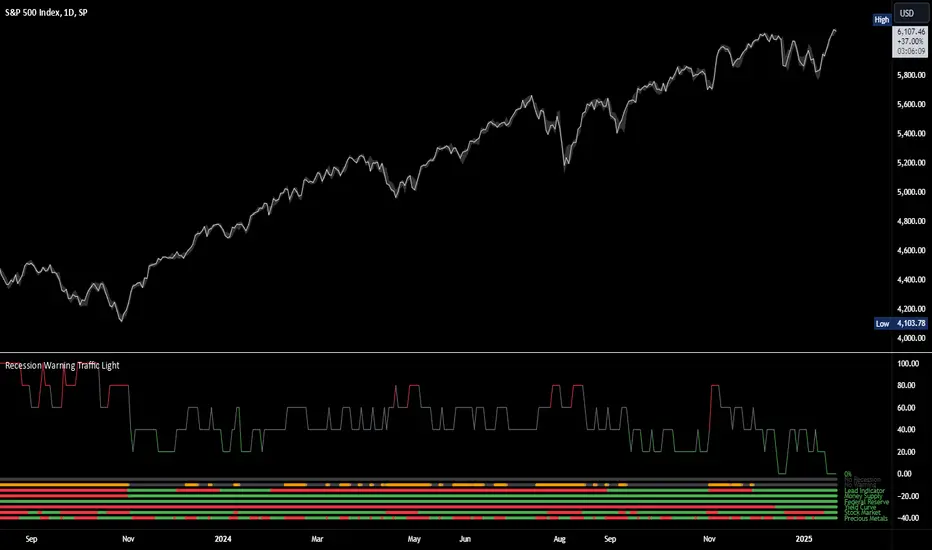 This is an indicator that uses 6 different metrics to determine the combined probability of a recession and compares the high probability warning periods against actual historical periods of recession.