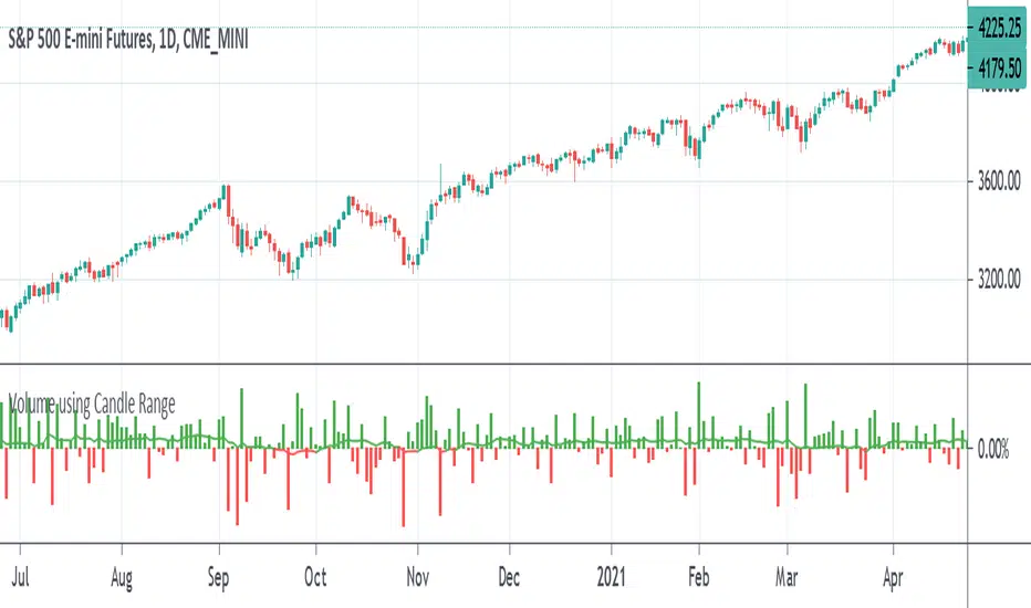 This is based on an idea I found about candlestick range bars implying volume. This is an attempt to put that theory into practice and to see if there's any truth to it. It's not exactly volume and may not always look like it, and it does not show how many trades took place but instead tries to use price in relation to the high and low range.