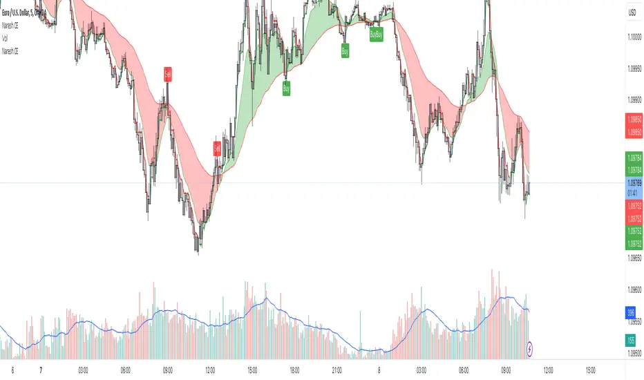 Buy and sell labels are plotted on the chart using plotshape() based on the generated buy and sell signals.
