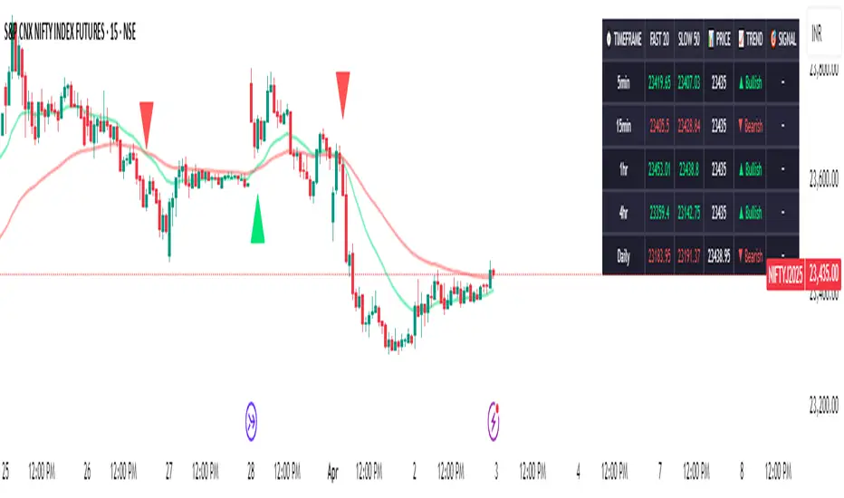 This indicator monitors 5 timeframes: 5min, 15min, 1hr, 4hr, and Daily. It displays fast and slow moving averages for each timeframe, along with the current price. The trend direction is color-coded: green for bullish (fast MA above slow MA) and red for bearish (fast MA below slow MA).