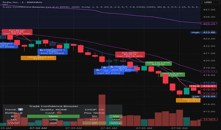 The Trade Confidence Booster is a comprehensive trading system that transforms chaotic price action into crystal-clear entry and exit signals. Built for day traders and scalpers who demand a clean, rule-based indicator with structure, clarity, and consistency — without clutter. This indicator combines institutional-level analysis with simple, actionable signals.