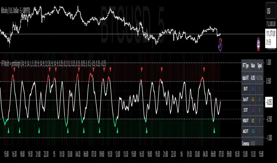 The Inverse Fisher Transform Multi-Indicator โ PROFABIGHI_CAPITAL applies the Inverse Fisher Transform to multiple oscillators like RSI, Stochastic, CCI, Williams %R, MACD, and MFI, creating a weighted composite signal for enhanced momentum detection. It helps traders identify overbought/oversold extremes, consensus alignments, and divergences through a smoothed, probabilistic view of market strength.
