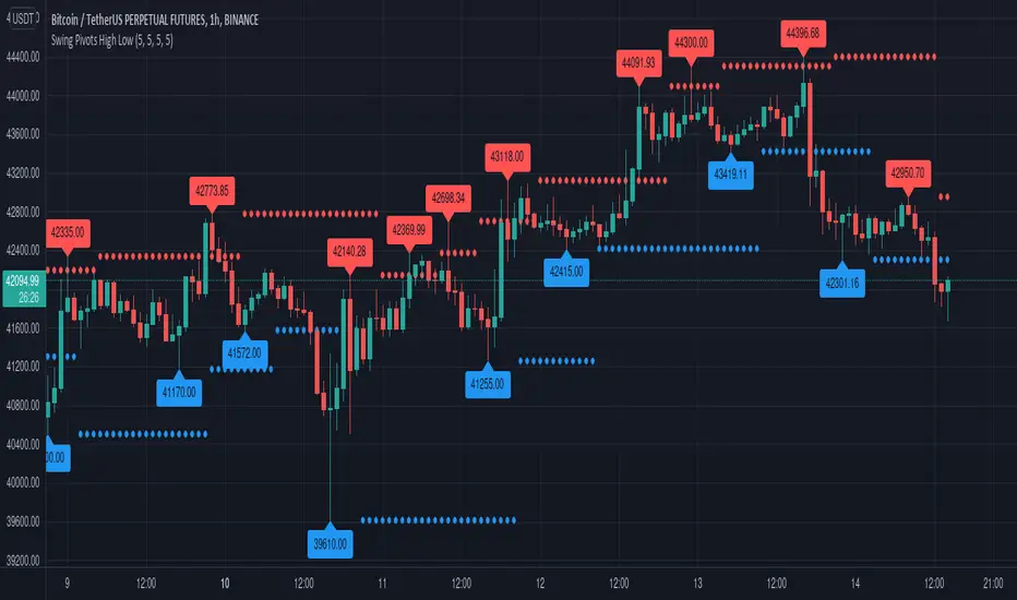 This indicator is an opensource merge of the built in 'Pivot Points High Low' and the most popular 'Swing-high-low-support-resistance' indicators. The original 'Pivot Points High Low' does not have extensions with better visibility, while the most popular 'Swing-high-low-support-resistance' has no source available. I've also added additional configurable alert conditions for Pivot High and Low Crossover/Crossunder.