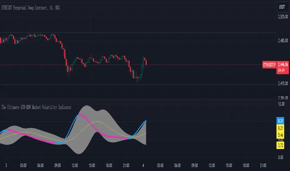 "The ATR-BBW Market Volatility Indicator combines the Average True Range (ATR) and Bollinger Bands Width (BBW) to provide a measure of market volatility. This indicator does not indicate bullish or bearish trends, but rather the magnitude of price fluctuations.
