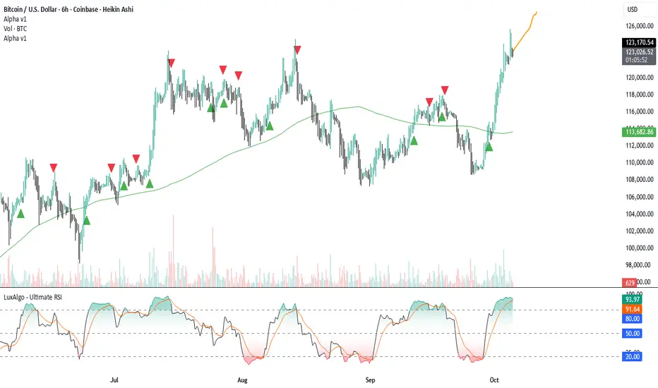 Heiken Ashi based indicator using moving average crossovers combined with LuxAlgo Ultimate RSI with custom weighting to trigger buy and sell signals. SMAs can be toggled under the style tab of indicator settings.