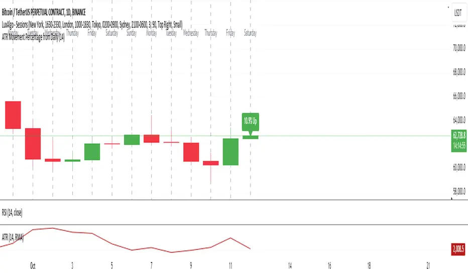 The script titled "ATR Movement Percentage from Daily" is designed to help traders analyze the price movement of an asset in relation to its daily volatility, as represented by the Average True Range (ATR). Here's a breakdown of how the script works:
