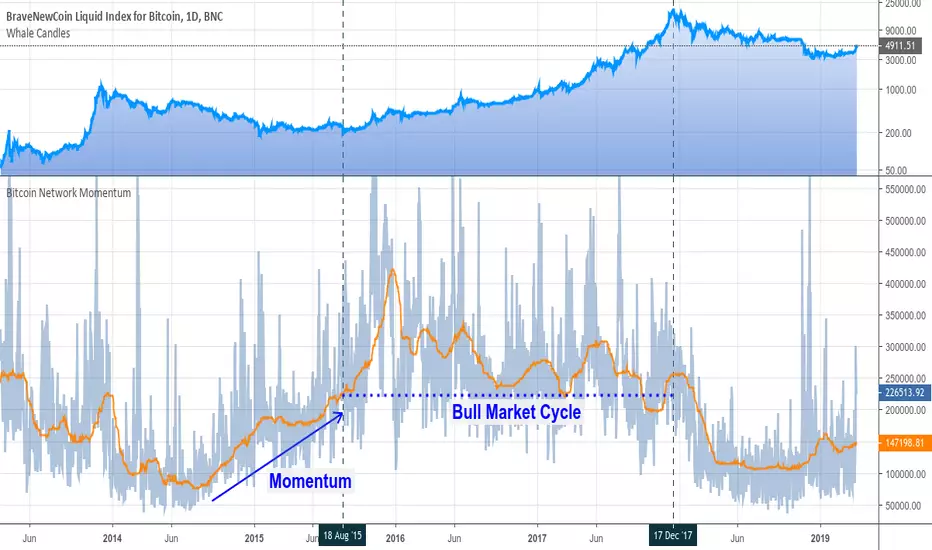 Bitcoin Network Momentum is a leading indicator that relates On-Chain Transactional Volume (measured in BTC)with the evolution of the Bitcoin Price.