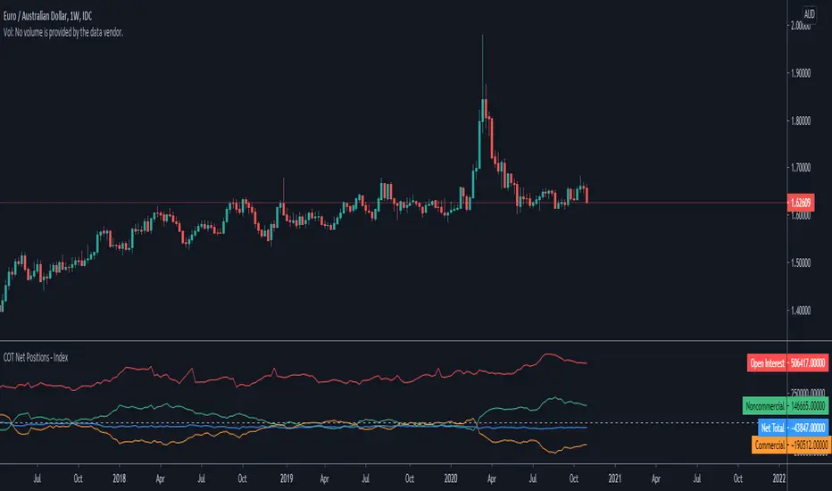 By default the total open interest and net total of all the positions are showing as well, however, these can be turned off in the indicator settings along with the noncommercial and commercial positions.