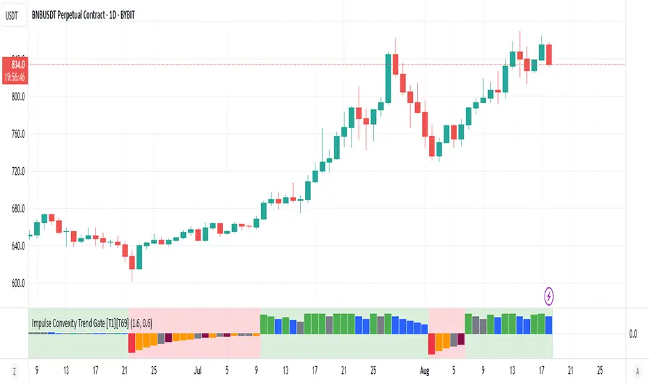 • Bull/Bear Gate Entry when gate is open, oscillator crosses ±15 in the correct direction, price is on the correct side of the midline, and slope/convexity agree.