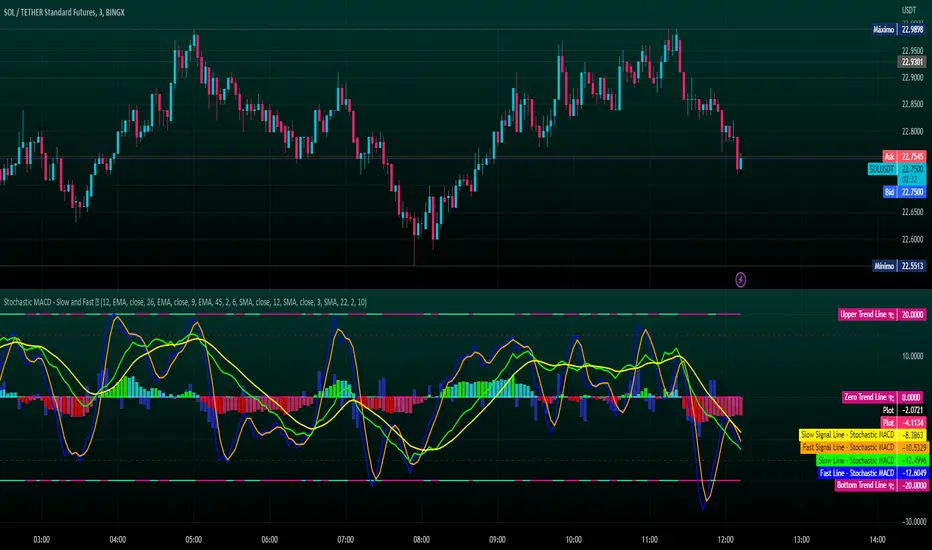 This script is an implementation of the Stochastic MACD indicator with two variations - Slow and Fast. It uses a combination of the Stochastic Oscillator and the Moving Average Convergence Divergence (MACD) indicator to identify trend reversals and momentum shifts in the price of an asset.