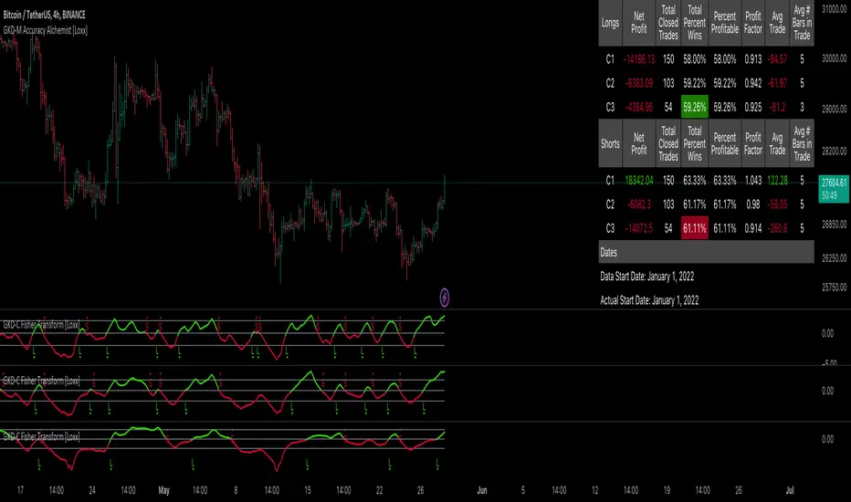 Suppose a long signal is generated by the Vortex indicator. However, this signal is disregarded because its accuracy is lower than that of the Fisher Transform. Now, imagine that the subsequent candle produces a long signal from the Fisher Transform indicator. This signal will be exported to the backtest. The GKD-C indicator that exhibits the highest accuracy for the current candle is chosen to generate the signal. The dominant indicator, determined by its accuracy, will always be used to generate signals. However, it is important to note that the current dominant indicator might not retain its dominance in the future if its accuracy rate falls below that of other indicators connected within the Accuracy Alchemist indicator.