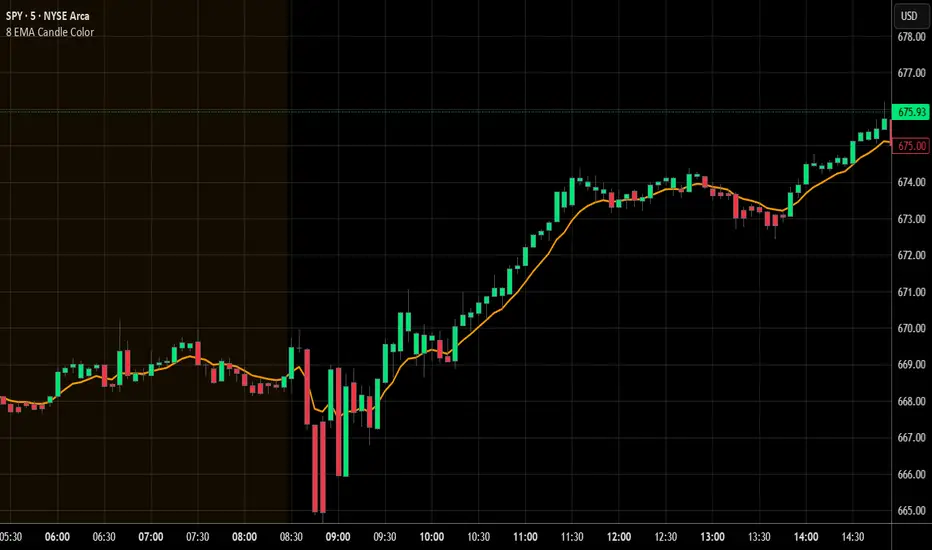 Just a quick indicator that I threw together that shows the 8 EMA and changes the candle colors if the candle closes above or below the EMA.