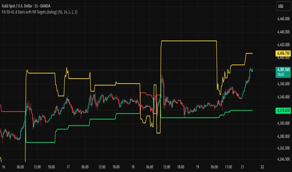 Fib 50–61.8 Stairs with RR Targets (debug) automatically tracks the latest swing and draws a 50%–61.8% Fibonacci pullback zone as step-like “stairs.” From that zone it plots a planned trade framework: entry reference, stop/invalidation, and multiple Risk:Reward targets (e.g., 1R/1.5R/2R/3R).