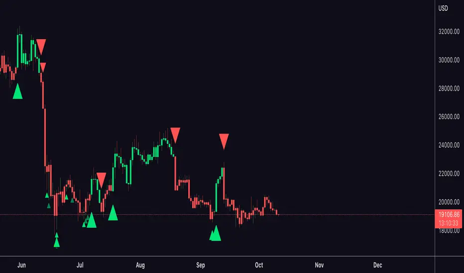Works on all timeframes and assets, no repainting (stays after candle close), configurable signal strengths.