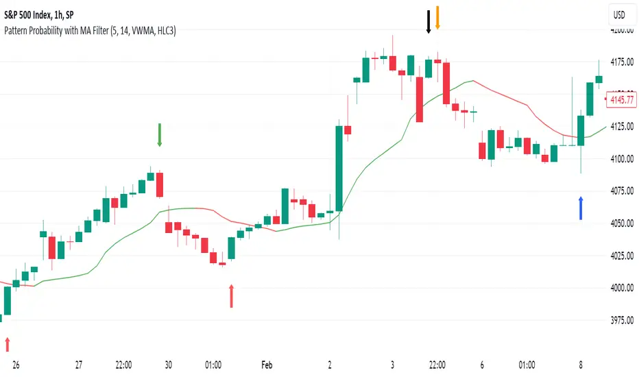 The indicator then plots arrows on the chart for specific pattern_type values while considering the EMA trend direction as a filter. It displays different colored arrows for each pattern_type.