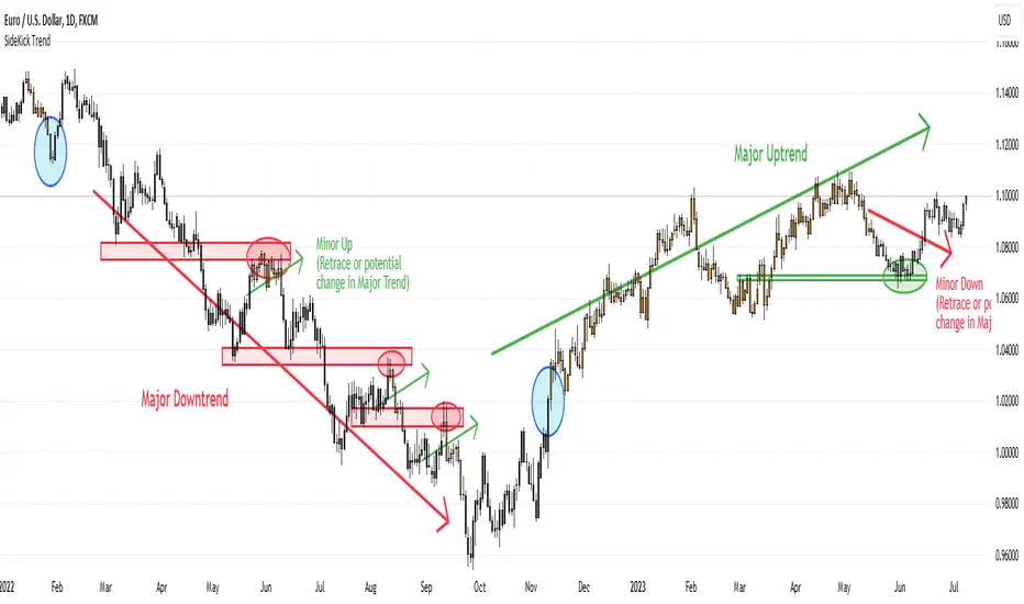 The major trend corresponds to the breakout of a major pivot point, while the minor trend corresponds to the breakout of a minor pivot point.