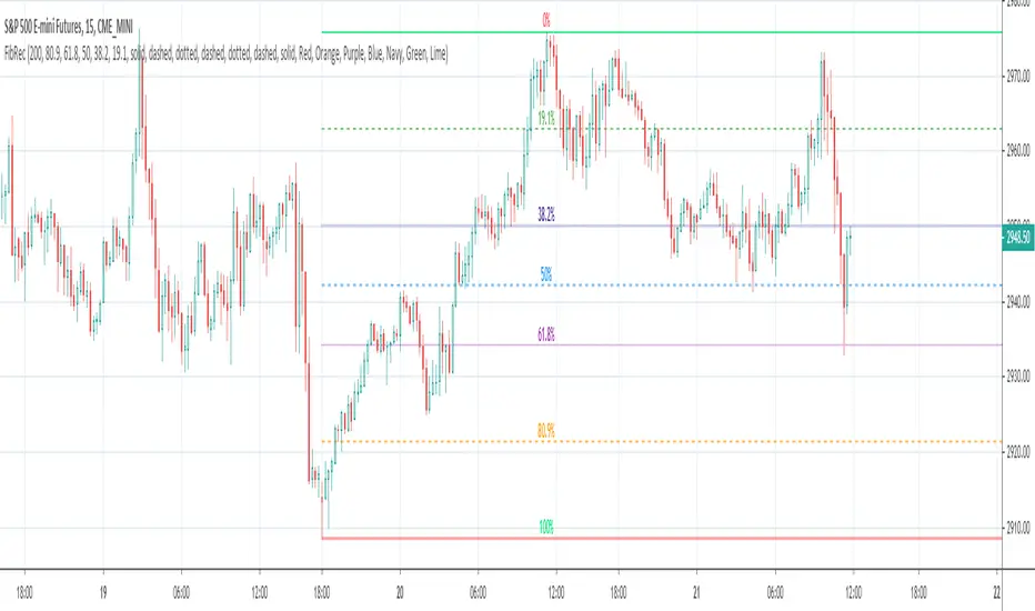 It shows the Fibonacci retracement support and resistance levels for a given range and display the corresponding ratio on the right side of the levels. The price range and levels are adjustable by user, you can easily identify the major and minor support/resistance levels from the chart with your desired inputs.