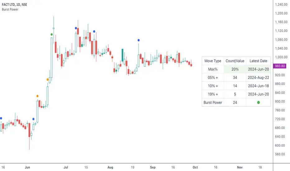This indicator is intended to identify stocks with high potential for significant price movements. By analysing historical price action over a user-defined lookback period, it calculates a Burst Power score that reflects the stock's propensity for rapid and substantial moves. This can be helpful for stock selection in strategies involving momentum bursts, swing trading, or identifying stocks with explosive potential.