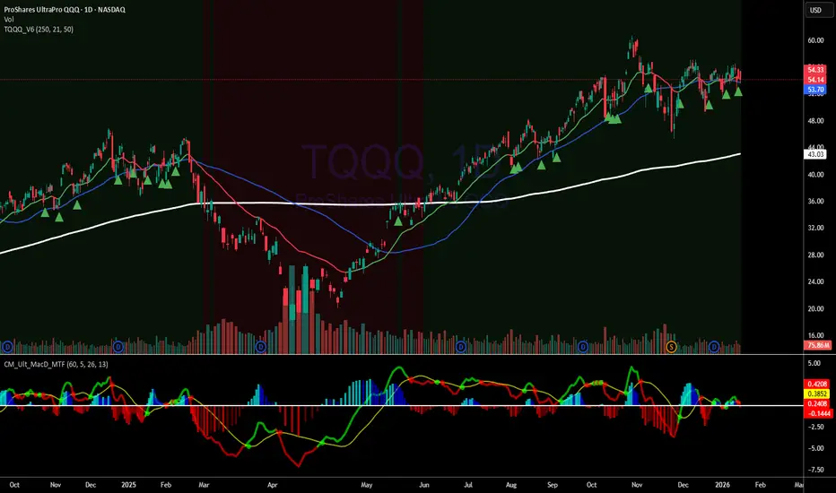 Background turns green when price is above the 250‑SMA (TQQQ bullish focus) and red when below it (implying SQQQ or defensive stance).
