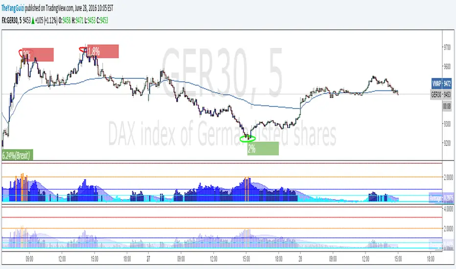 Shows difference between price and daily/weekly/monthly/hourly/whatever VWAP.