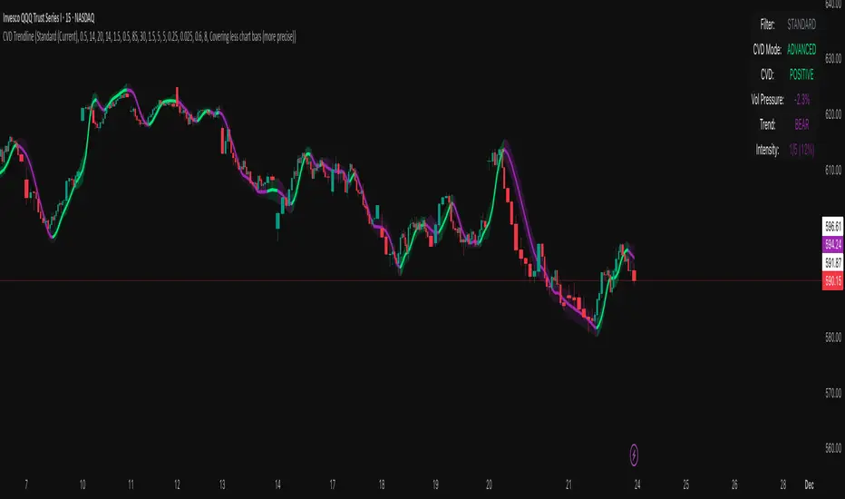 The core innovation here is the integration of CVD (the difference between buying and selling volume) directly into the trend calculation. This means the trendline doesn't just follow price - it follows the money. When smart money is accumulating or distributing, you'll see it in the line movement and cloud behavior before it's obvious in price action.