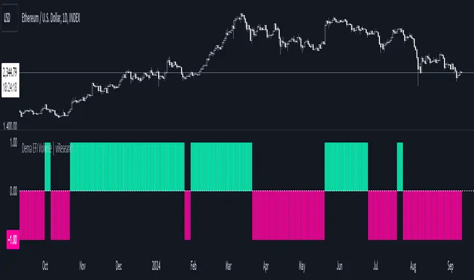 The "Dema EFI Volume | viResearch" indicator provides traders with a powerful tool for analyzing both price trends and volume strength. By incorporating this script into your trading strategy, you can improve your ability to detect trend continuations and reversals, making more informed decisions based on a combination of price movement and volume dynamics. Whether you are focused on identifying trend strength or looking for early reversal signals, the "Dema EFI Volume" offers a reliable and customizable solution for traders of all levels.